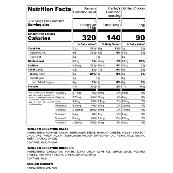 Romaine, red onions, sunflower seeds, Romano cheese, Hanley’s Sensation dressing, Hanley’s PO-BOY croutons.