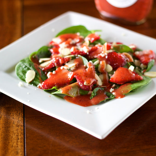 All Natural Ingredients: Strawberries (whole), water, red wine vinegar, cane sugar (locally sourced), extra virgin olive oil, poppy seeds, sea salt, xanthan gum, organic beet powder.